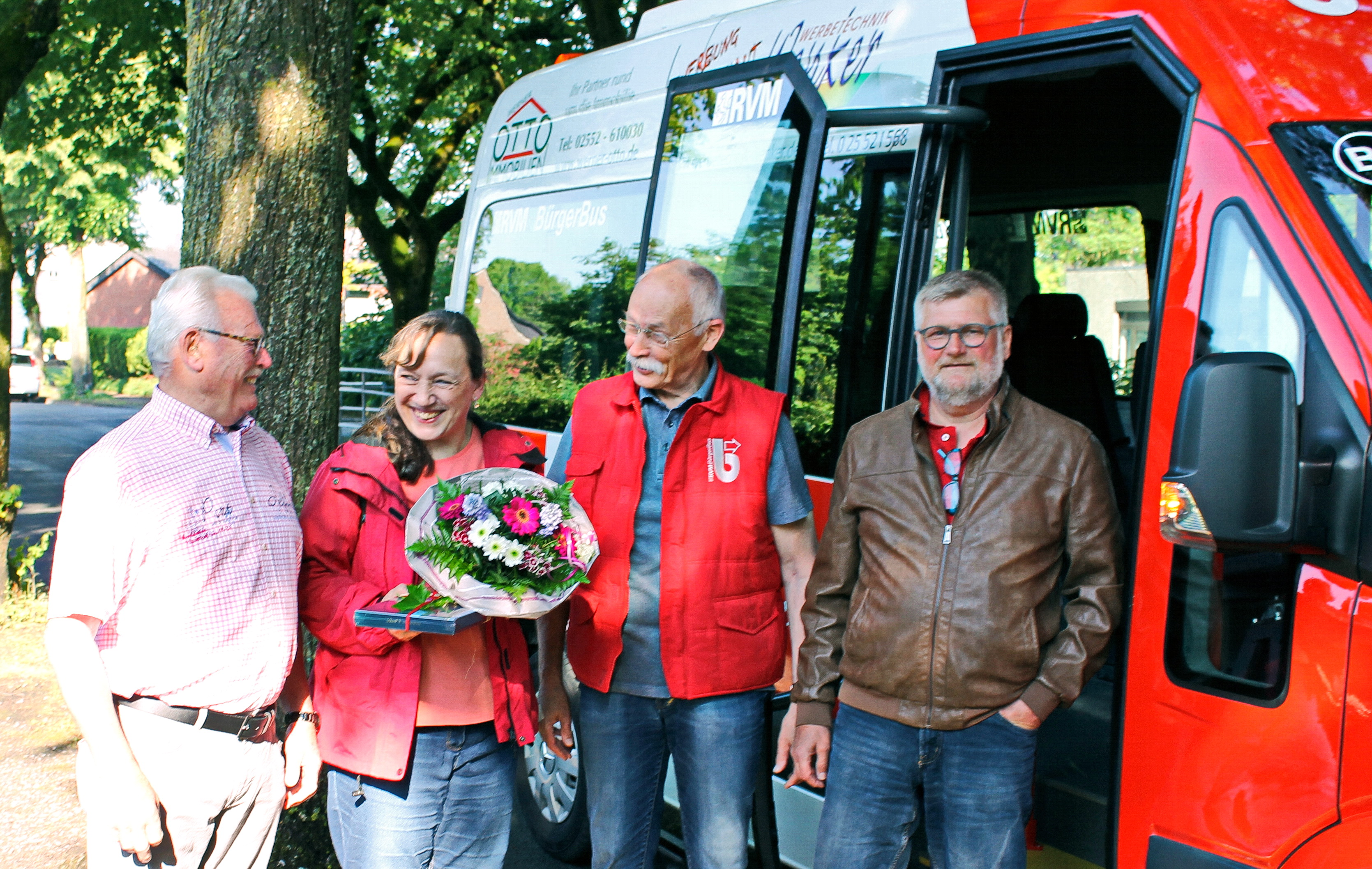 Das war eine Punktlandung: Gudrun Koloßka aus Steinfurt-Borghorst ist der 50.000. Fahrgast des Bürgerbusses Steinfurt seit dessen Start am 1.Dezember 2011. Vorsitzender Ferdinand Brust (links) und Fahrdienstleiter Wilhelm Klaassen (2.v.r.) begrüßten die Borghorsterin an der Haltestelle Gymnasium mit einem Blumenstrauß und einem Präsent. Frau Koloßka ist seit über vier Jahren „Stammgast“ im Bus und fährt damit von Borghorst nach Burgsteinfurt. Sie lobte vor allem, dass die Fahrerinnen und Fahrer immer nett und hilfsbereit seien. Darüber freute sich auch Fahrer Gerd Drzisga (rechts), der den Jubiläumsfahrgast befördern durfte
